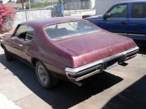 HERES A CALIFORNIA 1971 PONTIAC LE MANS 2 DR HARDTOP THATS ON THE BUTTON RUNNING DRIVING EQUIPPED WITH A V8/AUTO SETUP , ENGINE HAS WHAT APPEARS TO BE NEW ALLOY HIGH RISE INTAKE & CARB , DUAL EXHAUST WITH TURBO MUFFLERS , NEW FRONT FACTORY STYLE FRONT AND REAR SEAT COVERS (REAR COVER NEEDS TO BE FITTED ) NEW CORRECT STYLE DOOR PANELS AND REAR SIDE PANELS , NEEDS HEADLINER AND CARPET TO COMPLETE INTERIOR , DASHPAD IS IN BAD SHAPE FROM THE CALIFORNIA SUN , RUNS VERY STRONG AND SOUNDS GREAT , WHEELS/TYRES ARE NOTHING SPECIAL , TORQ THRUST/SLOT MAGSGM RALLY WHEELS AVAILABLE, CHANGE THE HOOD AND GRILLE PANEL AND MAKE YOU,RE OWN GTO LOOKALIKE